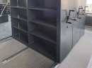 Произвели и установили мобильные стеллажи с индивидуальным цветовым решением на ковролин, с учетом всех технических требований к полу для безопасной эксплуатации. Металлические элементы конструкции были перекрашены из стандартного серого оттенка в черный, что придало интерьеру характерный промышленный вид.